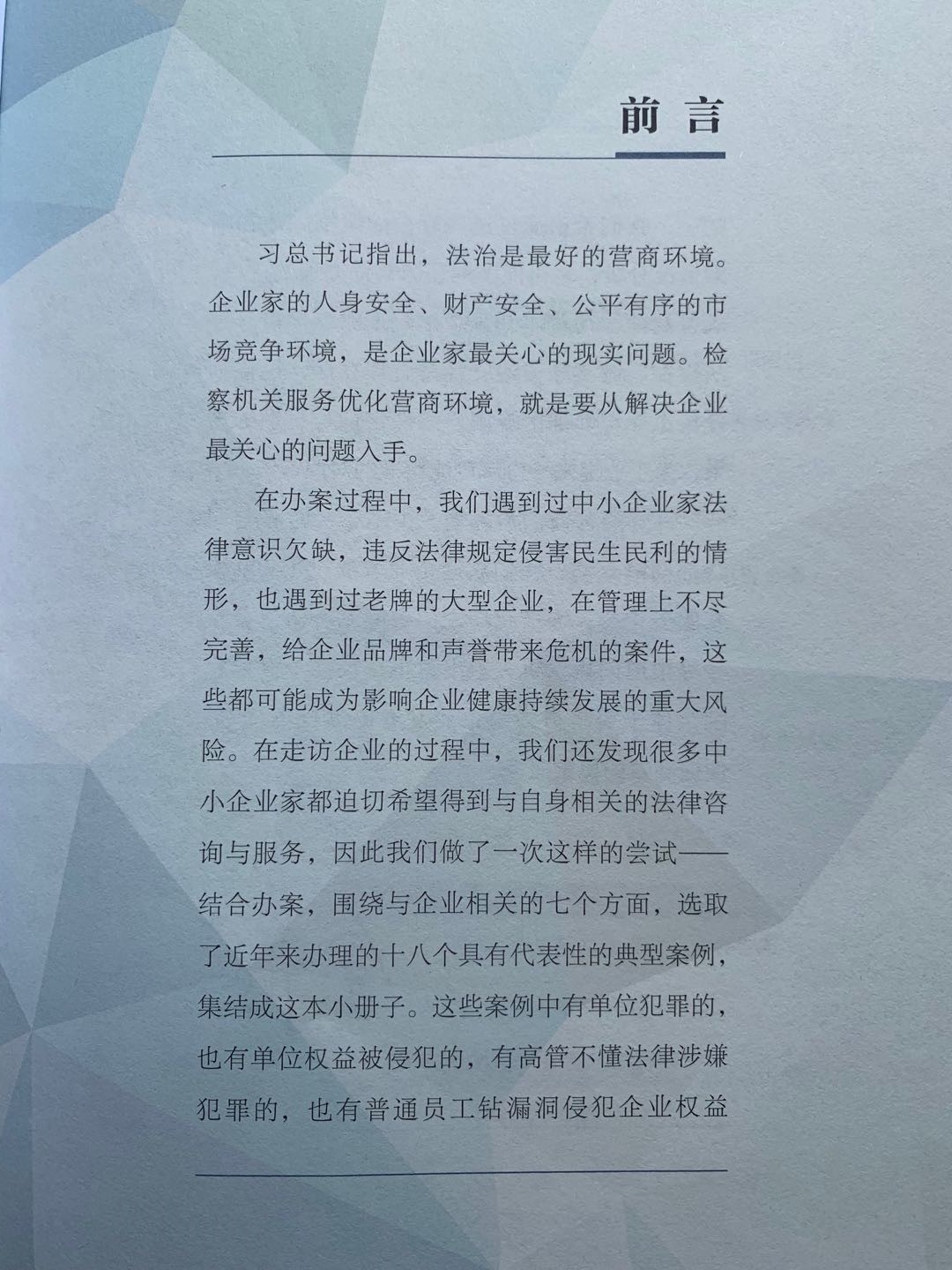 精准搭脉企业的司法需求,结合涉企案件的实际案发情况,对18起企业经营中常见的典型案例进行汇编,深入剖析案例中的高发风险点及相关法律法规,努力为辖区民营企业的健康发展提供优质的法律服务。组织开展了“检察护航民企发展”主题检察开放日活动,邀请企业家代表走进我院,听取意见建议。