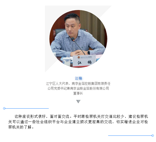 南京市人民检察院党组成员、市纪委监委派驻第四纪检监察组组长吴昌森、江宁区人民检察院全体院领导及各部门负责人参加了座谈会。