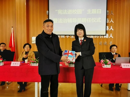 演讲结束,在掌声中,南京工业技术学校校长张雨向侯淑云主任颁发聘书,正式聘任侯淑云主任为该校法治辅导员,新任的法治辅导员现场向学校赠送了见面礼~精品法治教材和法治宣传光盘组成的“法治大礼包”会在今后成为同学们的必修课内容。